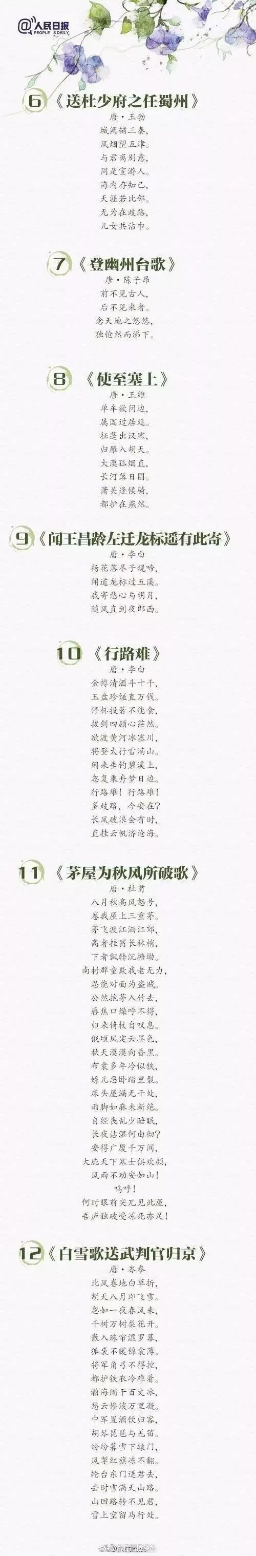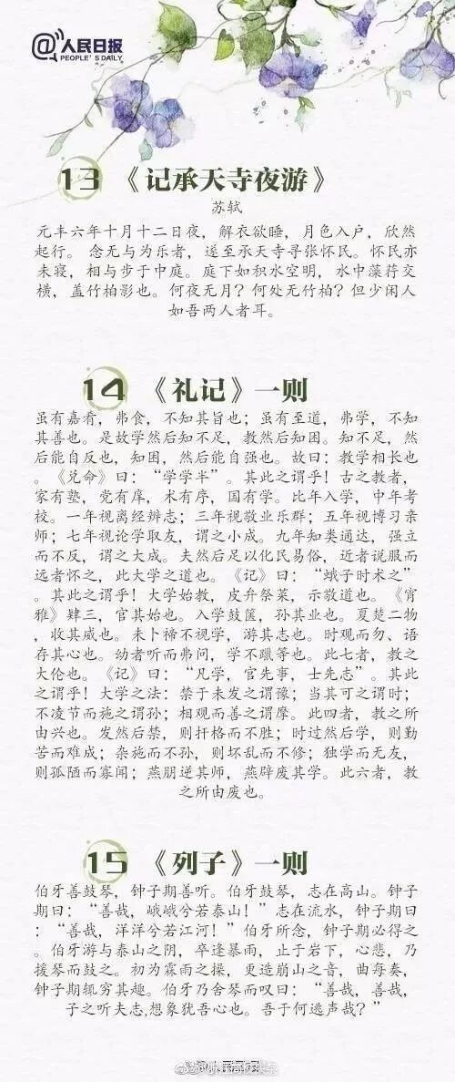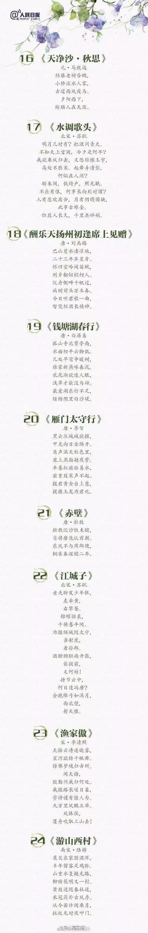 ▼这些背诵篇目,人民日报官博也给整理了40篇出来,分享给大家: