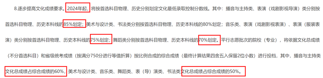 2024年起,将按shou选科目物理、历史分别划定文化最di录取控制分数线。其中:播音与主持类、表演(戏剧影视导演)类分别按shou选科目物理、历史本科线的85%划定;美术与设计类、书法类分别按shou选科目物理、历史本科线的80%划定;音乐类、表演(戏剧影视表演)、表演(服装表演)类分别按shou选科目物理、历史本科线的75%划定;舞蹈类分别按shou选科目物理、历史本科线的70%划定。